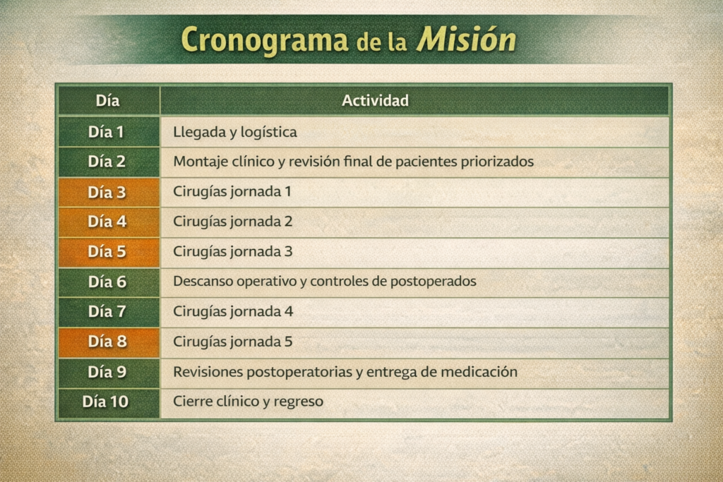 Antes del inicio de la misión, se realizará una fase local de identificación y priorización de pacientes, con apoyo comunitario, traducción e intermediación territorial.